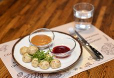 подаются с белым соусом и соусом из клюквы
