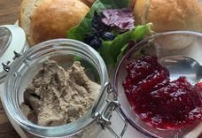паштет собственного приготовления, подается с вареньем из клюквы и булочками либо фокачча на выбор